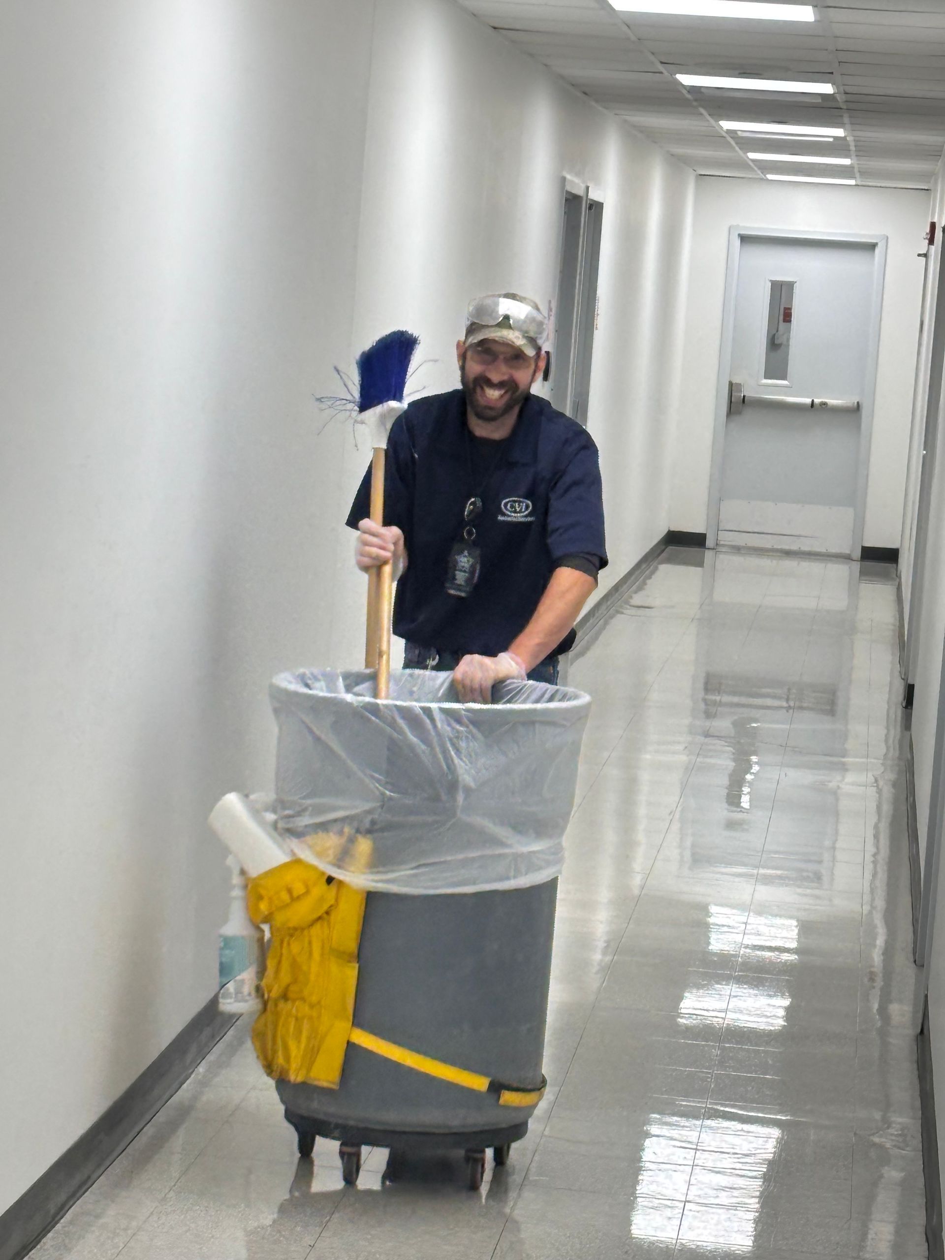 Mike starts every day with a smile and a sense of purpose. In this photo, he’s pushing his cleaning cart through the hallway, ready to take on whatever the day brings. While Mike usually works outdoors mowing and maintaining the grounds, he’s always willing to step in and provide cleaning support inside when needed. His flexibility and dedication make him an important part of our team. Whether he’s working under the sun or keeping our indoor spaces spotless, Mike takes great pride in doing his job well and making our environment shine. #AbilityOne #AbilityNotDisability #TeamARC #SourceAmerica #CleaningWithPride #InclusiveWorkforce #Teamwork
